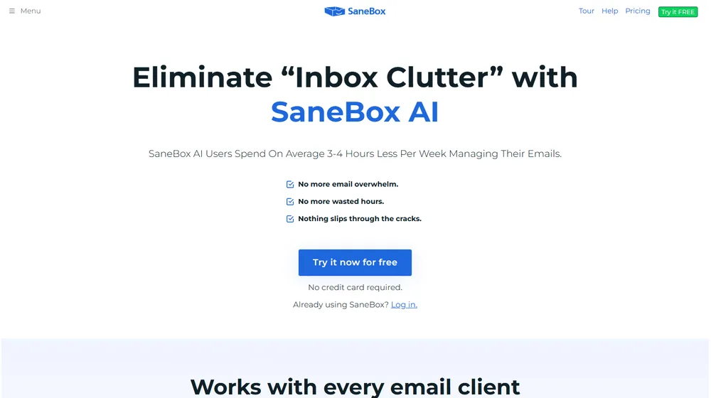 - AI-powered inbox filtering: automatically moves unimportant emails to folders like SaneLater, surfacing priority mail first.